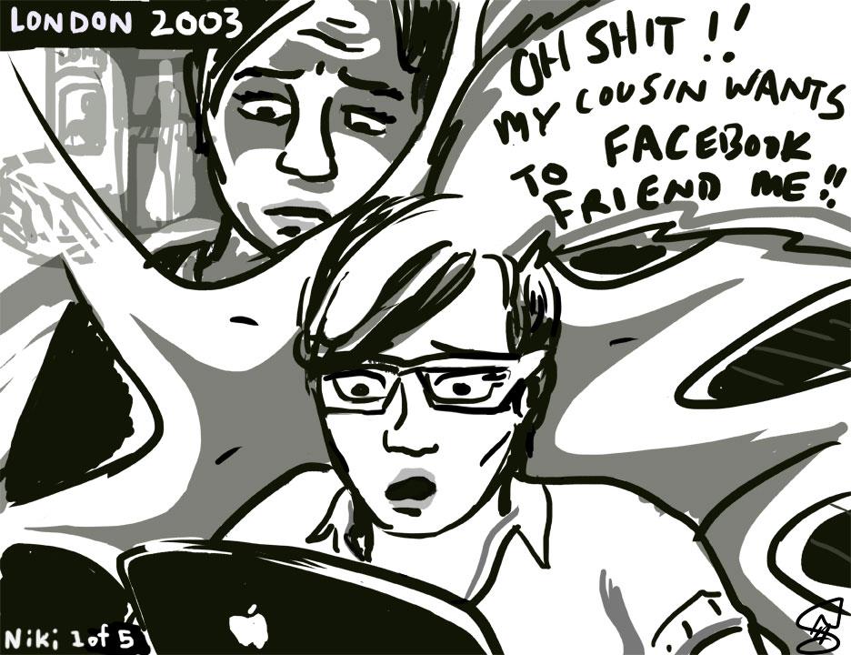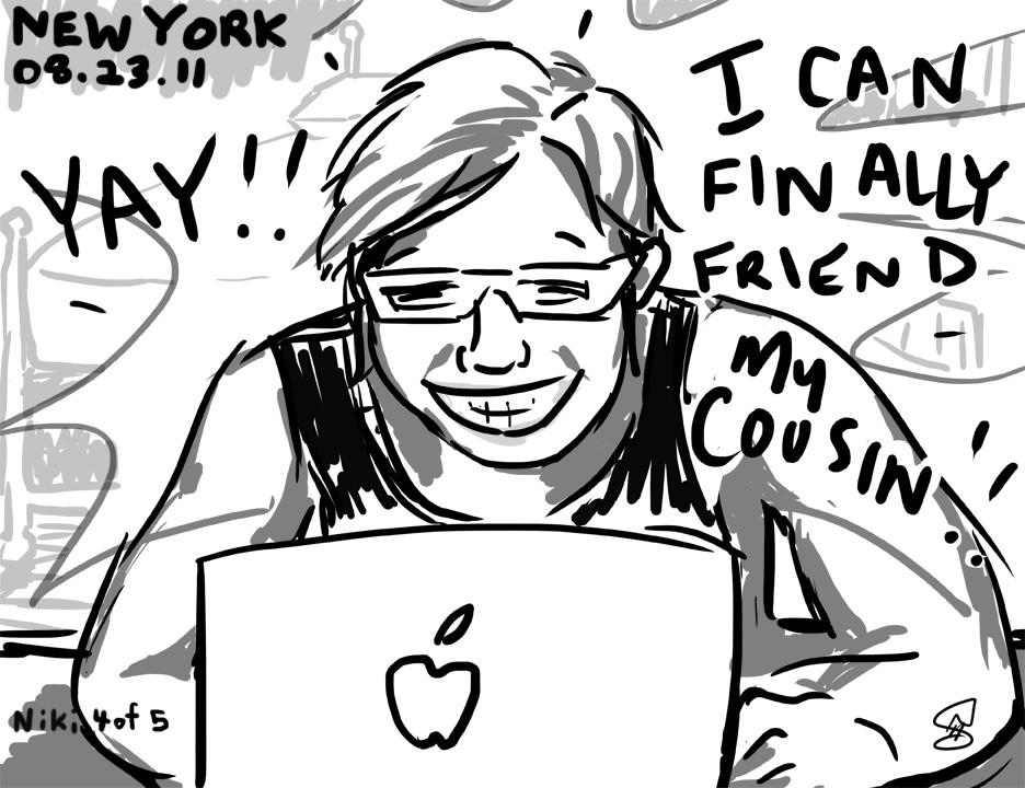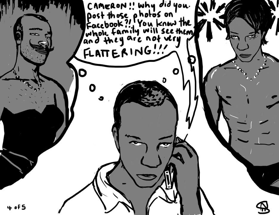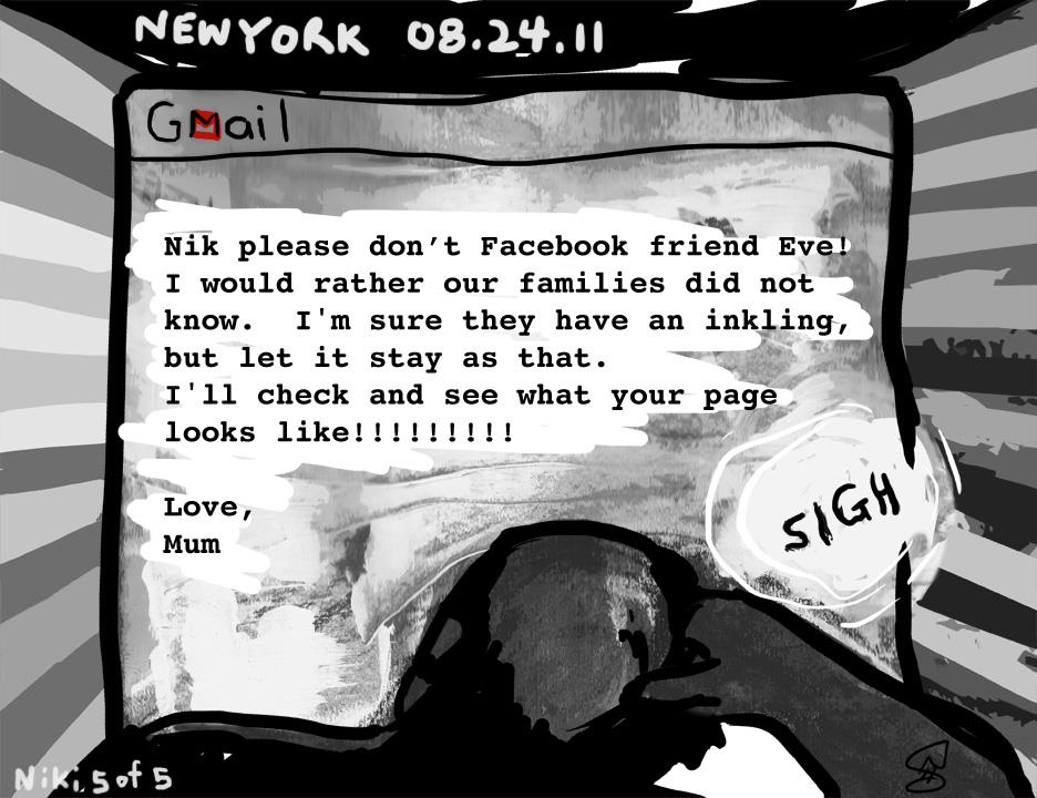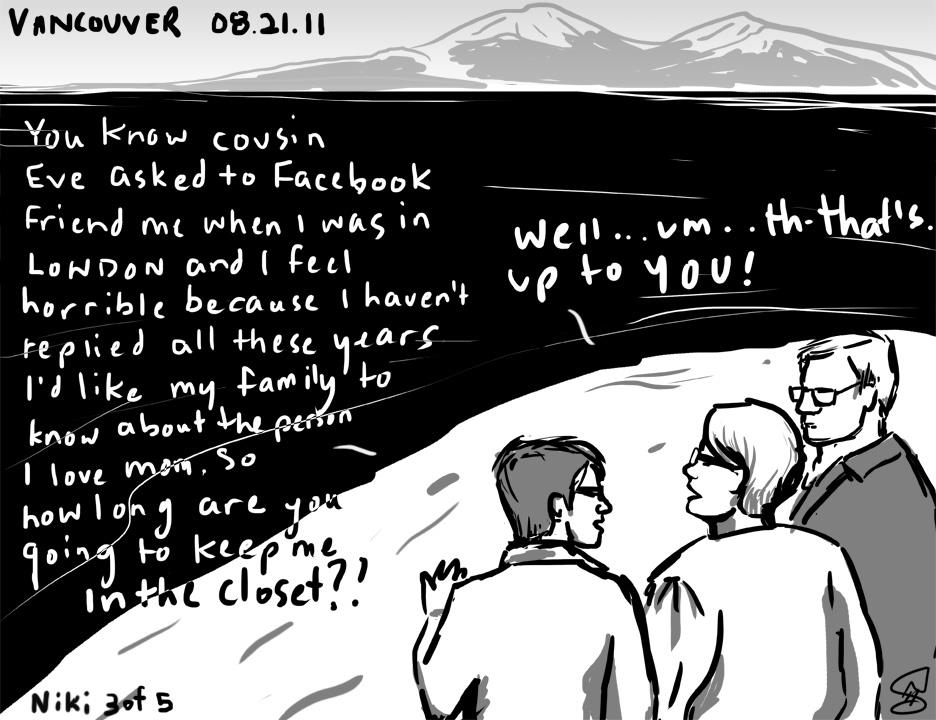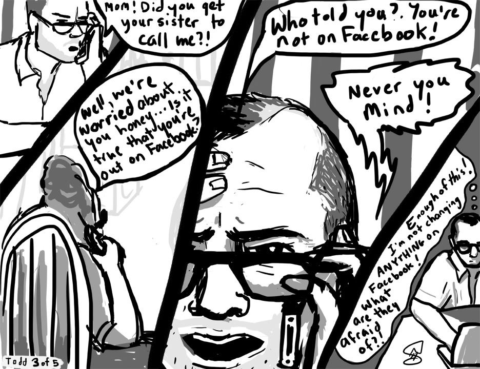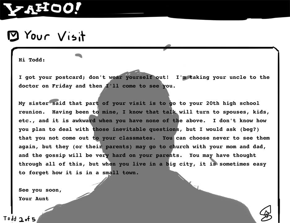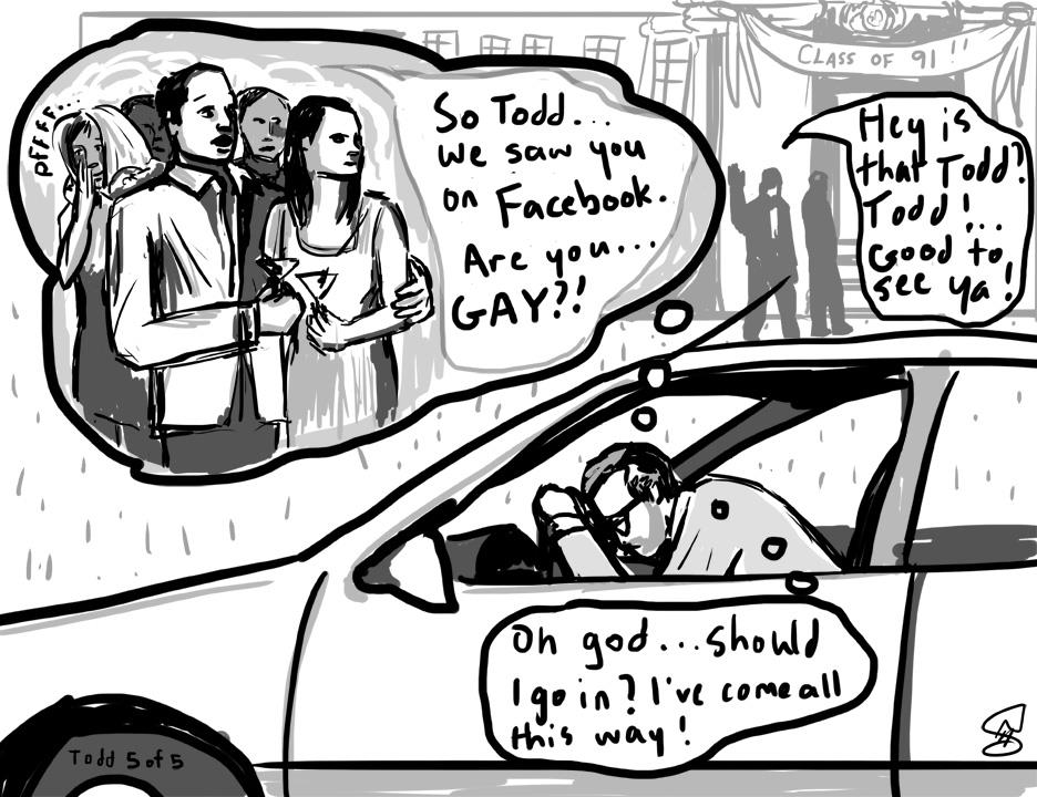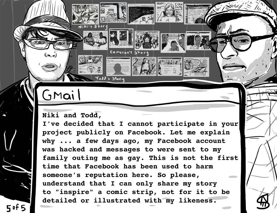 [*Five or so years ago Canadian artist Niki Singleton and I made a Facebook project called Coming Out of the Web 2.0 Closet. We both had a story whereby ‘friends’ or family members had used social media to shun us or tell us we were going to hell or something similar for being gay, and out. A couple more friends from NYC and Beirut gave us their stories to render in five-frame comic strips. I hear HIV being referred to in a variety of coded ways (like having a House In Virginia), and for sure we talk about it as a second closet to come out of … so I decided to reboot this project here in the LUV scrapbook (of things). I’m also really fond of another work we made called Host-an-Occupier along with Danish collective Wooloo and Mexican-American artist Alicia Marvan. xo Todd]