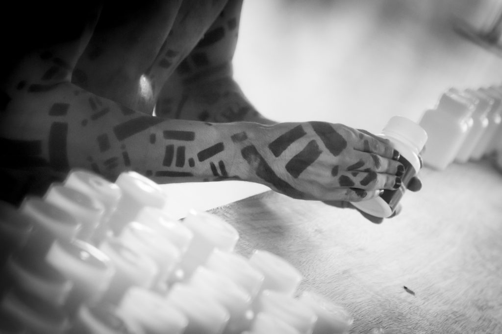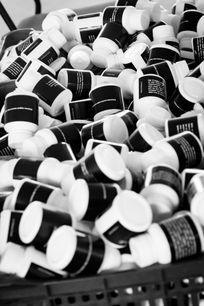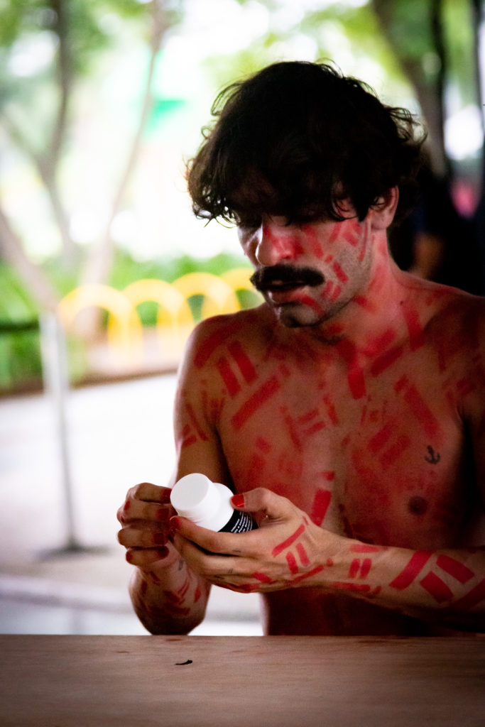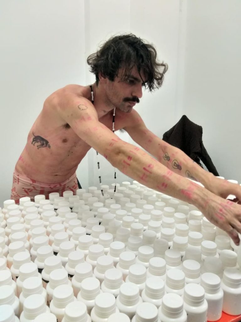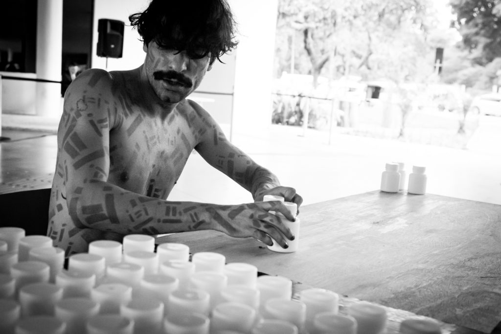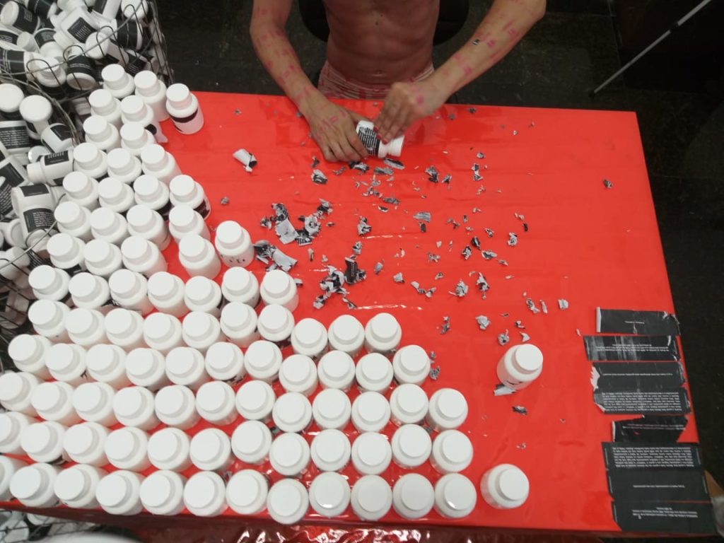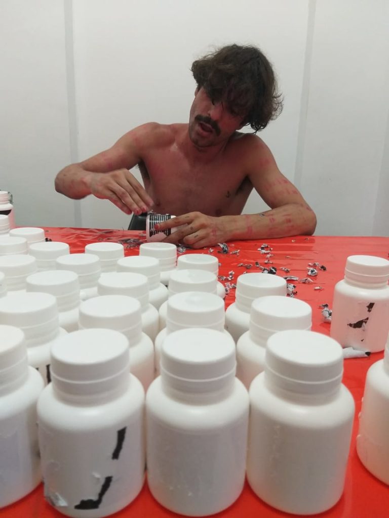 I was able to get an assistant in Cairo to help me with the production, all of the flasks and labels were locally produced. The flasks were even easy to find, but for the labels we had to go through at least 4 print shops that did not want to print them out because they contained the words “gay”, “HIV”, and “Aids.” These are all words that are prohibited from even being mentioned in that country. My assistant had to say that it was a work for college. The guys cut up the labels while laughing a lot and being disapproving of it. The performance was a success. Although it still did not have a lot of format, for being the first, it was censored, I was not allowed to be shirtless, and there were cops filming every movement at the Biennial opening. It was all in English, so I think that the chances of it being censored diminished. I had never before found myself being watched by so many people, I even remember a child that offered my things to drink and helped me remove the labels, it was strong! It lasted 3 hours, almost the entire opening, and I felt that those who understood it felt a mixture of pity and compassion. In the end, some men came to hug and thank me for that move. I suppose that they were positive. I did not get involved with the country’s causes, I did not have time, we tried to get in contact with the UNAIDS there, but without success. But for me, as a proponent, to be there and to be taking those words that can’t even be said out loud, printed onto 740 medicine flasks, already gave it meaning to me.