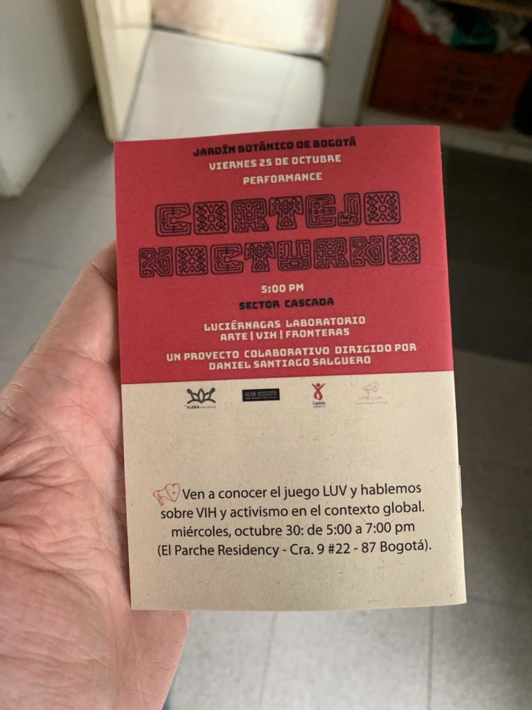 As I detail in Relatory Bogotá, I got to take part in the final piece of Luciérnagas with artist Daniel Santiago Salguero, offering me up-close access to a performance intervention in Bogotá’s Botanical Gardens on a Friday night with thousands of people around enjoying the cool night.