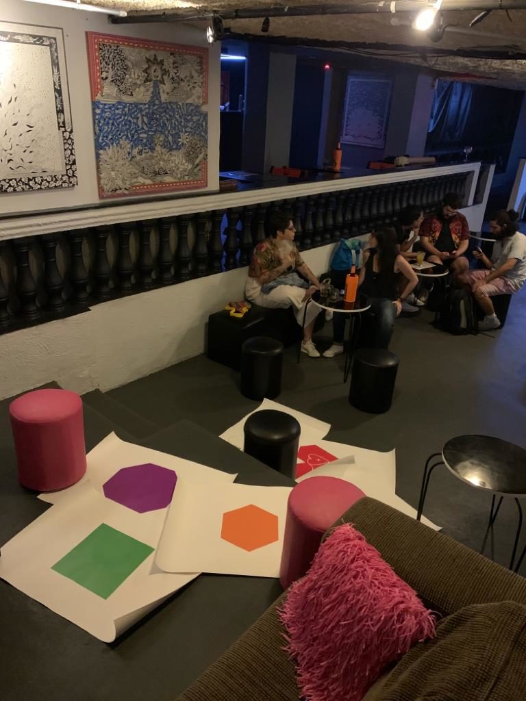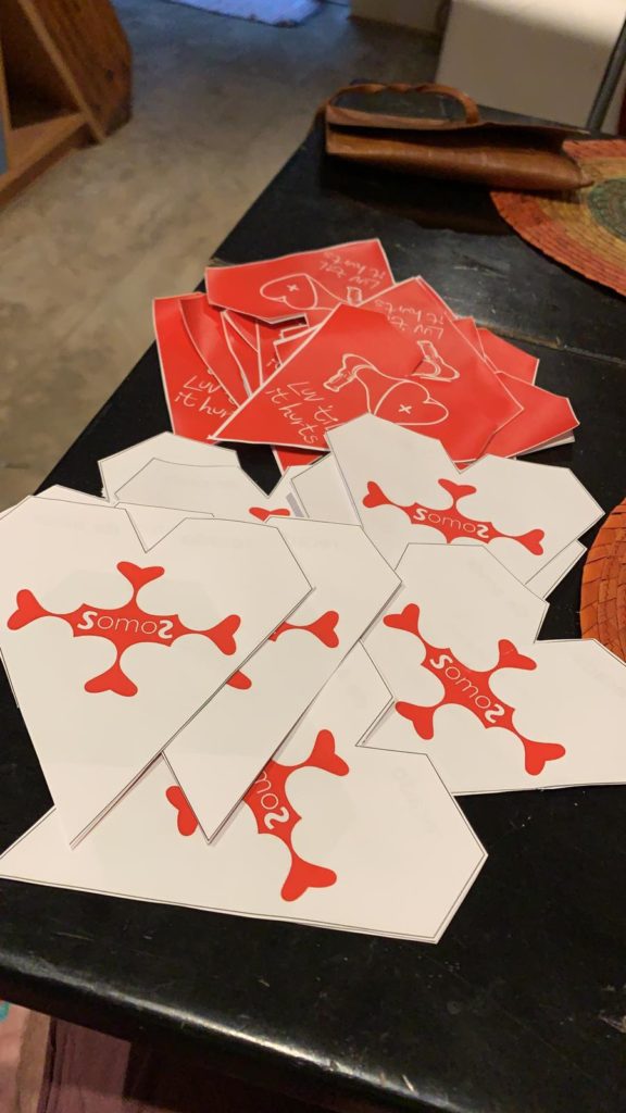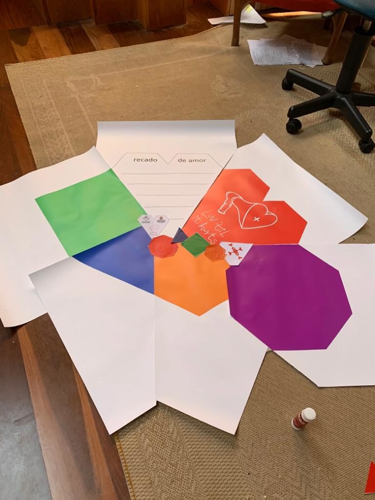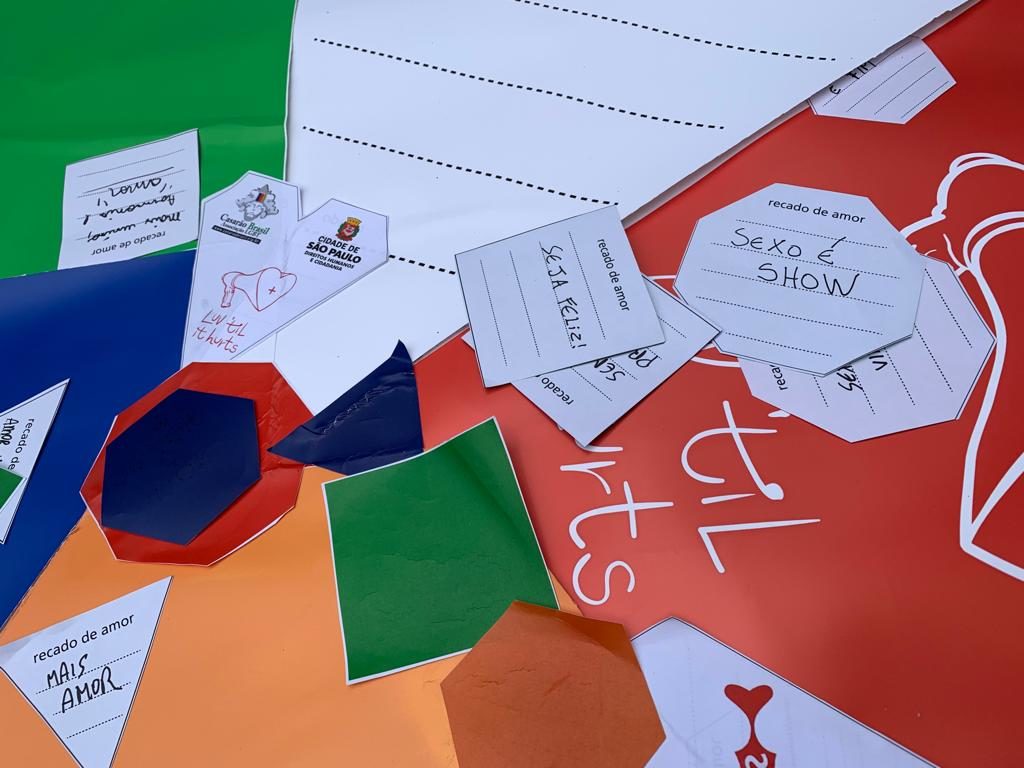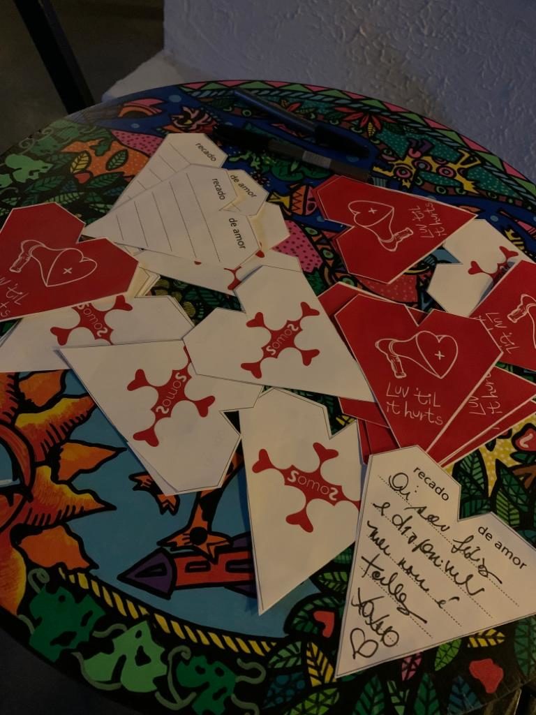 One idea came up that we liaise with the Municipal Secretary of Human Rights. As a member of Somos Mais, I would offer up the LUV game as a dialogue piece and lean into the performance atmosphere. We already had some of the first cloth hearts that George was making, so it was easy to engage folks to write ideas, thoughts and questions on the paper tiles but first telling them what we intended to do the following day with cloth tiles. And we gave away the first of them to people who intended including members of Coletivo Gleba do Pêssego who screened their film ‘Bonde’ during the Sarau.