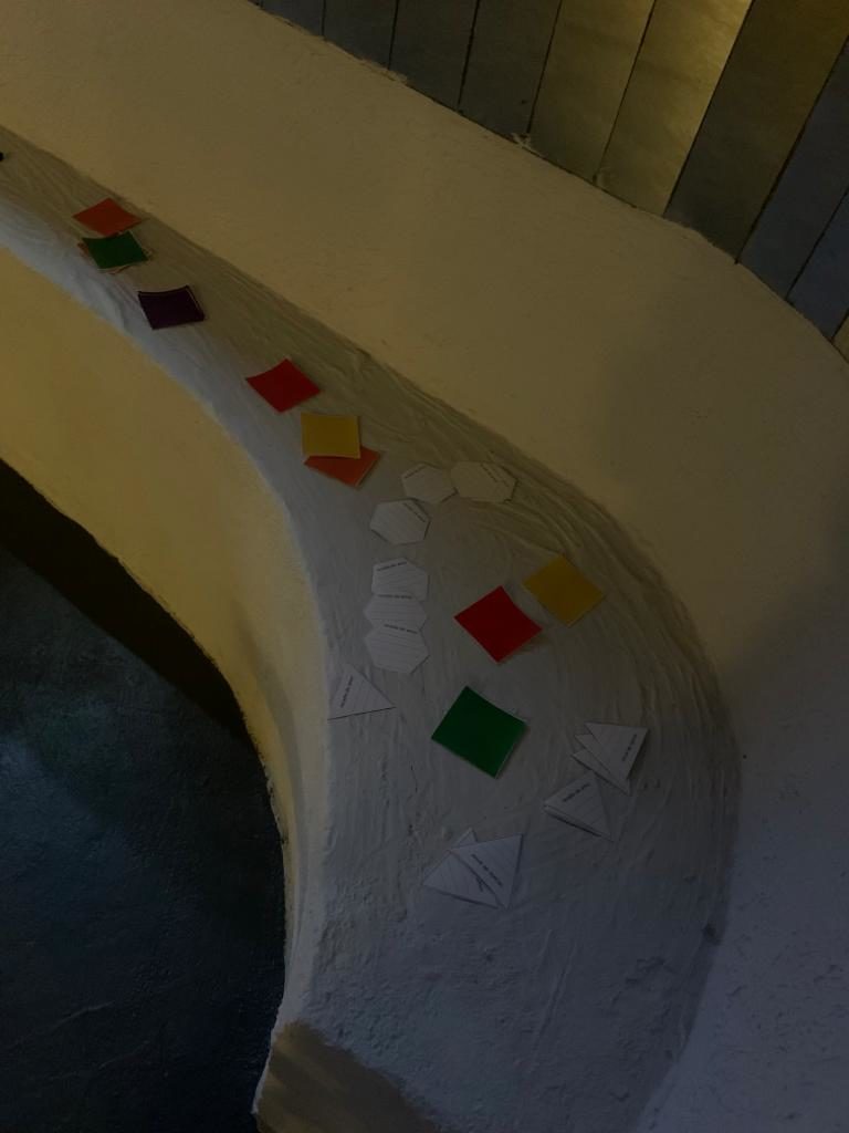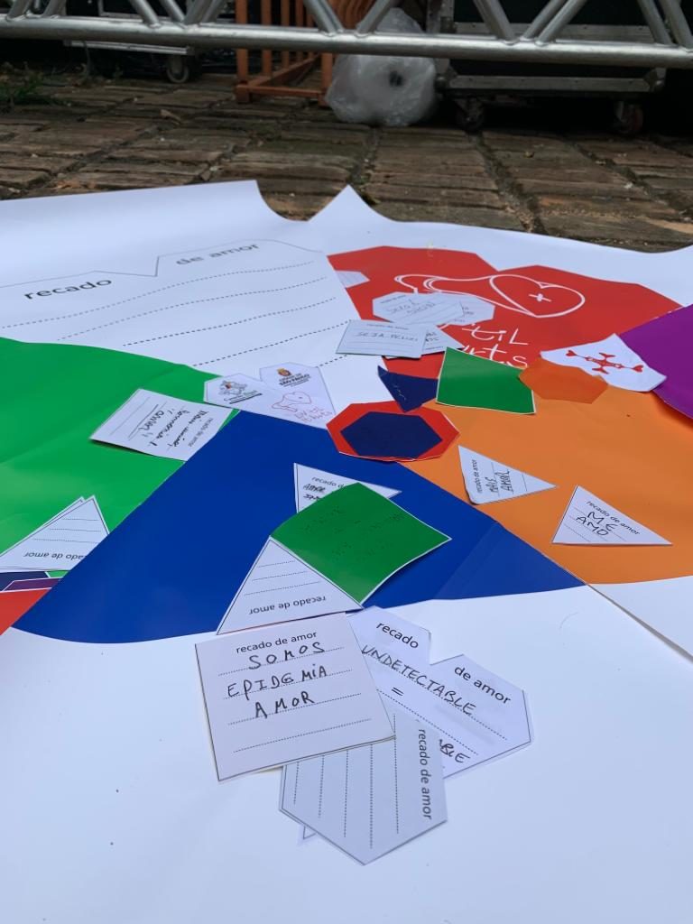 The following day we personally distributed (offered) over 60 more hearts to walkers on the AIDS walk and at the public park where it ended. Giving the heart is an expression of love and I’m still digesting all the encounters I had when offering them and tying them around people’s necks. The game was more of a ‘display’ with big tiles at the public park where the walk ended. People wrote notes (or ‘recado do amor’ without being prompted and laid them on the large tiles in formation on the pavement. We had all walked hard, and there were beautiful performances of theatre and poetry and talks with the artists going on. No explanation was needed.