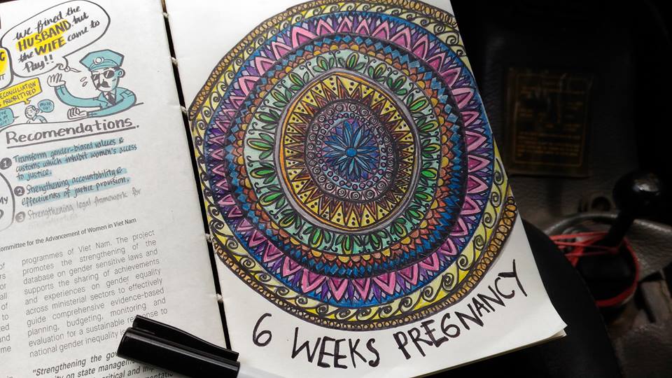 I remember going to service station to fix the car with my husband. On the way I suddenly drew in a small notebook that I always bring everywhere. I don’t understand why, and I don’t know what I was drawing. It was circle with so many layer and pattern inside. It’s a repetition pattern. I realize something, every time I traced the pen I feel so much better. My husband ask what am I doing? What I am drawing? And I said I don’t know, but I feel good.