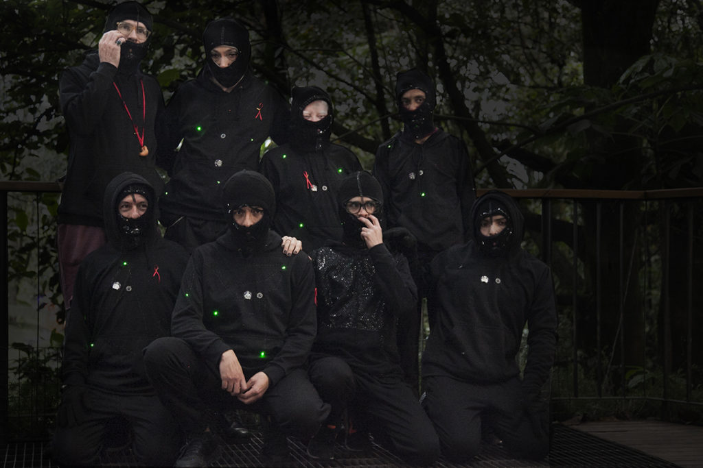 Before the presentation we did some in situ rehearsals, although they were never enough, we did them. The Botanical Garden is a very bureaucratic institution and it was difficult to manage the space for more preparations. For these last sessions we got together Eudes Toncel, a Guajiro Colombian artist, writer, and anthropologist, with special interest in the themes of gender and afro cultures. Almost all of us arrived in time for the presentation. Laura Figueroan, a very good friend of mine, came over to help us with the details, and brought us ski masks, which were intervened upon with fancy black stones, which went really well with the costumes. We had been cooking up the LED lights in the last weeks, with the help of Duvan Puerto, who arrived in the project thanks to Juan Sebastián Jaramillo and the creativity and technology agency that they worked at. Megan Cross Star, a member of the laboratory, was one of the people who had the most interest in the process, and especially in her costume for this night. She brought jewelry, make up, and was truly very elegant. As it was the night at the Botanical Garden that is open and free, many people came. More than we expected. After 6 months of planning and speculation , the day had arrived. It rained a lot that week, but luckily this day was clear, and both the members of the lab, as well as the visitors, were all able to calmly visit the Botanical Garden.
