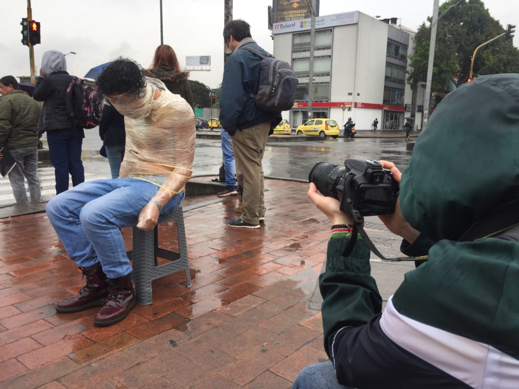 JDLM: El cortometraje lo realizamos para la Escuela Nacional de Cine en Bogotá, Colombia. Como yo soy director y personaje principal necesitaba un grupo de trabajo que estuviera muy conectado con la historia y la situación. Yo comencé a comunicarles mis miedos, mis sensaciones y lo que quería transmitir y justo en esos días hicieron un simulacro de evacuación en Bogotá, entonces acudiendo a mi frase de forrar en látex el amor les propuse que me envolvieran en papel de alimentos para caminar por el sector de la ciudad donde estaba el simulacro.